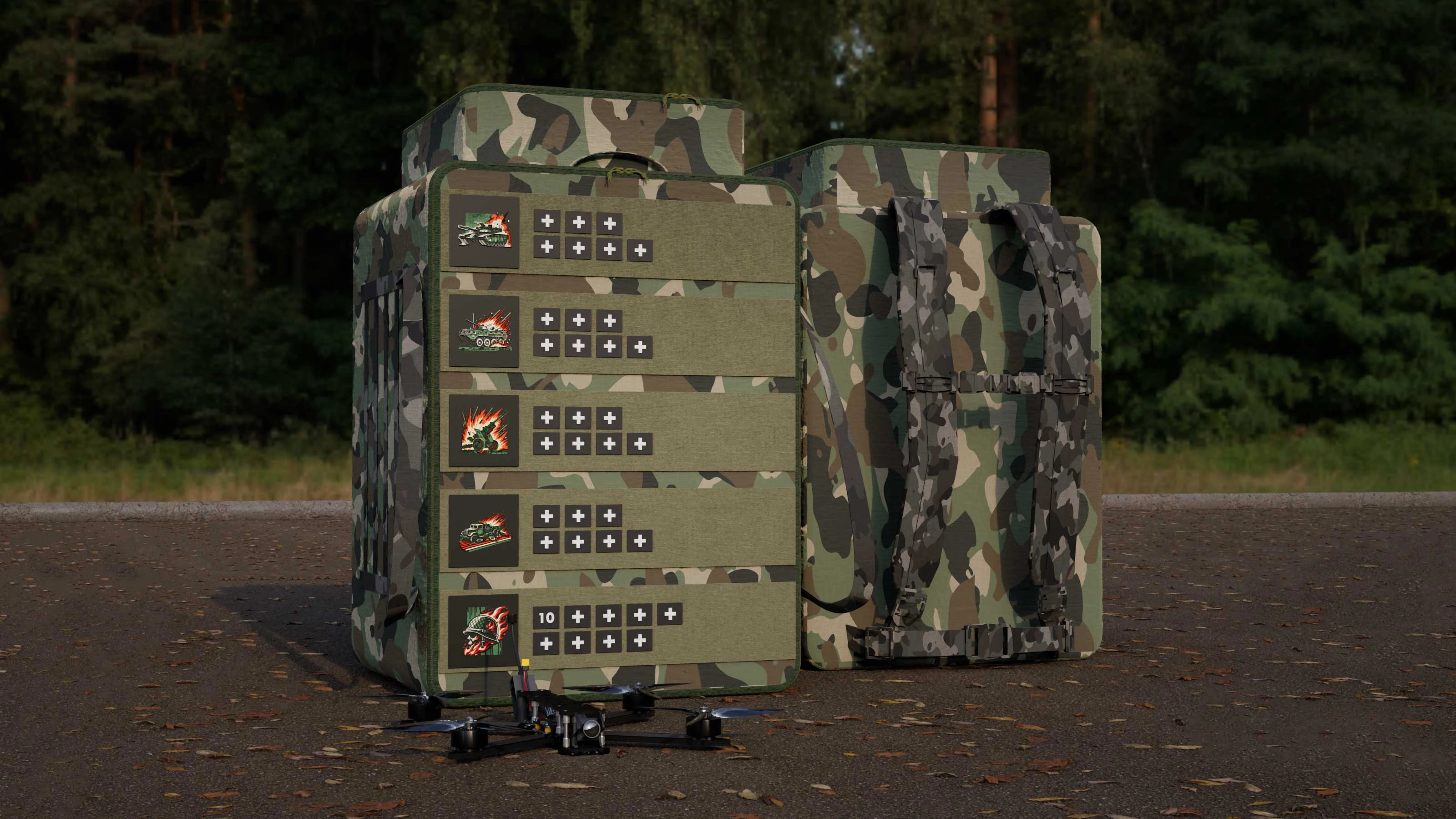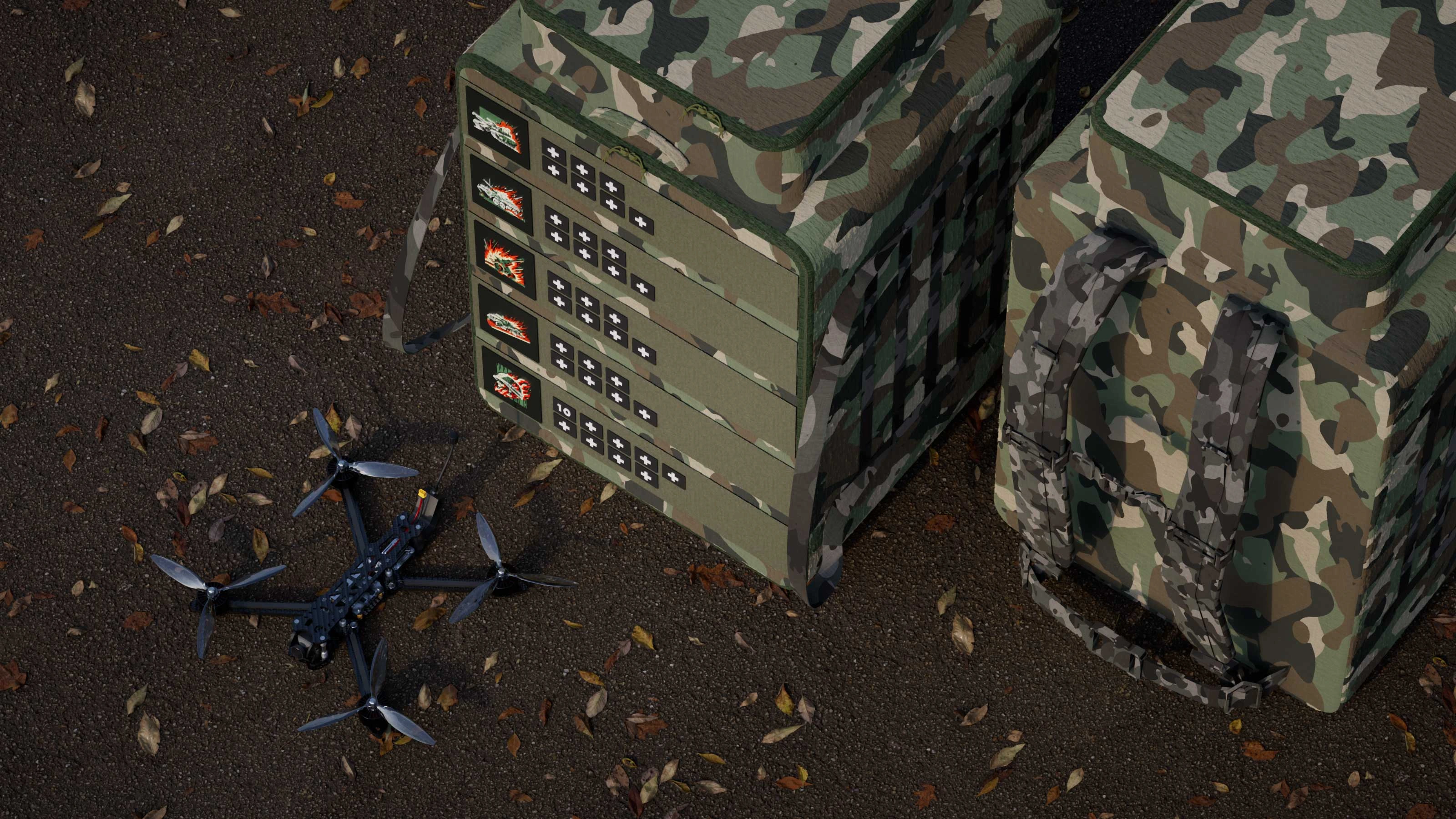 A backpack designed for transporting FPV drones and crew equipment, built for convenient and secure carrying of the full kit to operational positions.